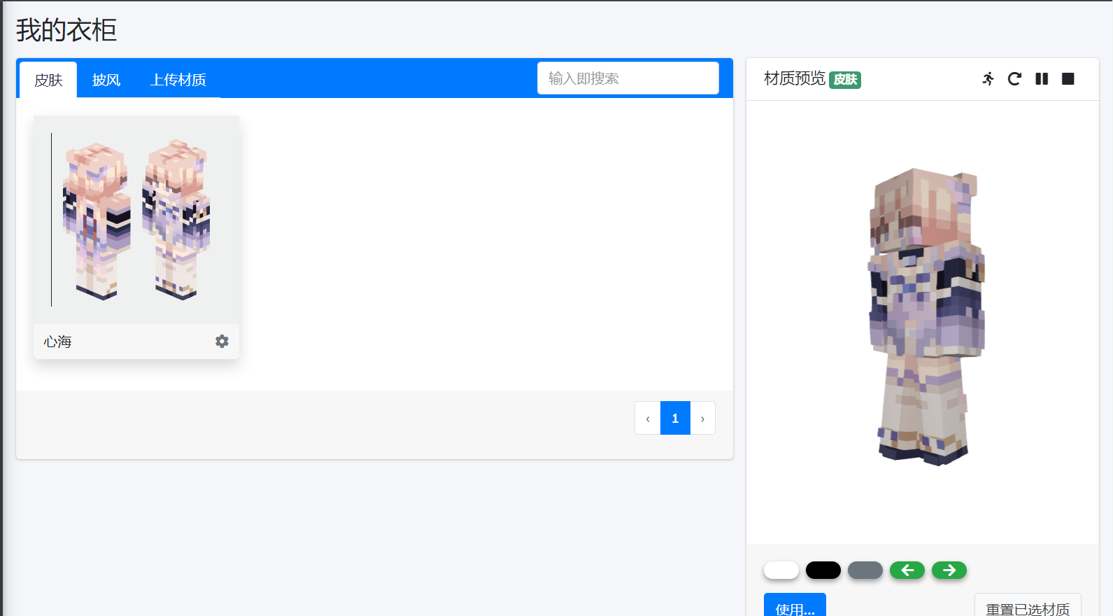 其中上方的按钮“上传新皮肤”可以把你的皮肤存入皮肤站,在下方也可以浏览、搜索别人已经上传了的皮肤。每个角色右下的爱心按钮可以将该皮肤收藏到“我的衣柜”。点击角色图片,可以浏览更详细的信息,也可以把皮肤设为头像,或是下载到本地。